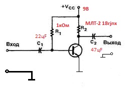 тоесть когда ставлю на коллектор 1кОм за место МЛТ-2 18rjnx то звук начинает сразу хрепеть,а если на 500Ом то он греться начинает,вот уже парюсь ве перепробывал но не получается...внизу схема и фото...на фото ве припаяно проводами без дорожек на плате