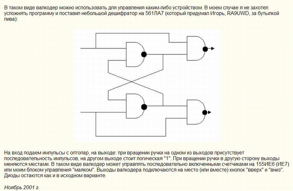 Тема, конечно, умерла, но вдруг кому понадобится. Топикстартер хотел заменить кнопки "больше"/"меньше" энкодером. Очень удивился, что у такой, казалось бы, примитивной задачи не нашлось решения НЕ на основе МК. Почему-то начали придумывать схемы с триггерами, генераторами стробсигнала...наверное я невнимательно читал, но так и не понял почему. А тем временем, именно для решения такой же задачи у меня уже седьмой год работает простенькая схемка на основе всего навсего одной попсовой 7400. Она же 555ЛА3. По началу боялся проблем с дребезгом, но по сей день полет нормальный и проблем нет. Хотя, справедливости ради, скажу, что повторял схему с одним энкодером, который уж очень дребезжал и ни о какой стабильности речи не шло, пока не заменил его на другой. Принцип работы описывать наверное нет смысла, все предельно просто. Вместо первой кнопки вешаем терминал А энкодера, вместо второй - В. С на землю. Выходы 8 и 11 выдают соответственно сигнал низкого уровня в зависимости от направления вращения энкодера либо на одной, либо на другой ножке (то, что и нужно). Энкодер самый обычный, квадратурный со сдвигом 90 градусов. Срабатывает схема четко, никакой грязи на втором выходе при активном первом (и наоборот) не наблюдается, как в одной из приведенных выше схем.