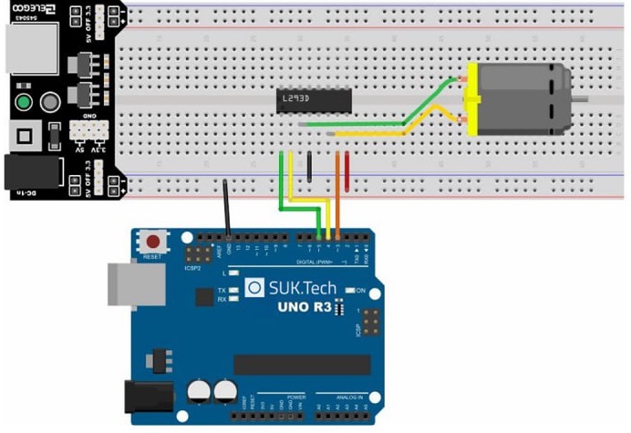 на схеме двигатель уже подключен через драйвер L293D.