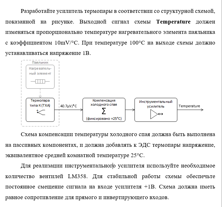 Проектировал схему инструментального усилителя для термопары типа K(при 100° должен быть 1В, а при 450° - 4.5В) и наткнулся на проблему - не очень понимаю, как мне задать постоянное смещение +1В на входе усилителя в моей схеме. Смотрел схемы в интернете, тыкался сам, но результата это не дало, так что помогите, люди добрые И заранее спрошу - верно ли выполнены условия задания?