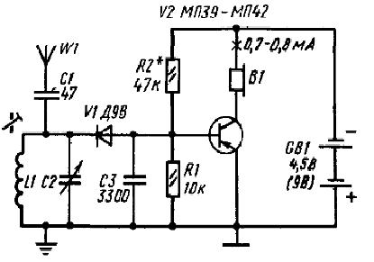 Эта схема вообще работать не должна. К диоду приложено запирающее напряжение, равное смещению на базе транзистора. Диод всегда закрыт, и нифига детектировать не должен... |