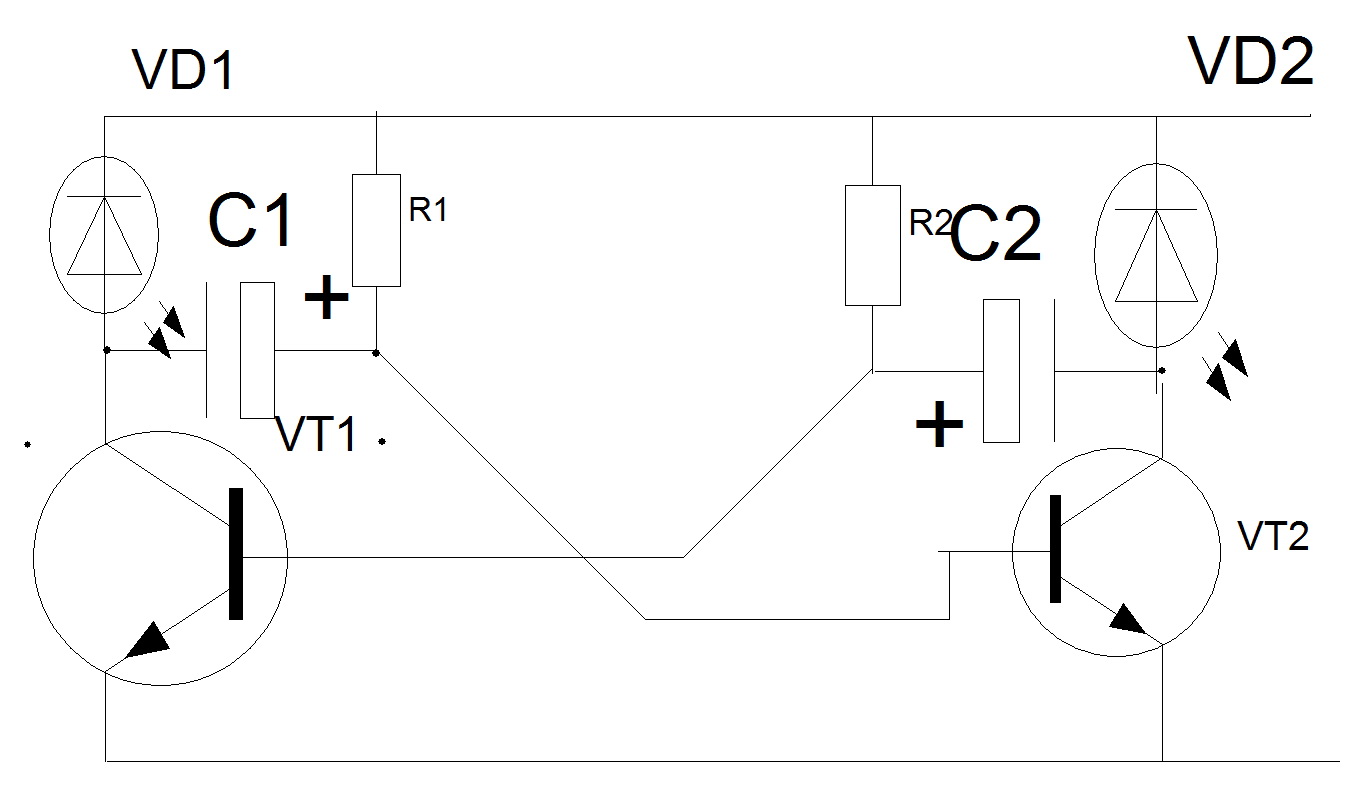 __Я часто делал на n-p-n-транзистрах К315 (VT1-VT2) и К972 (VT3-VT4). Первые выдерживают малую нагрузку, поэтому можно ставить в мультивибратор, вторые - большую - целесообразно использовать как ключи.