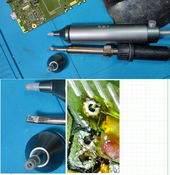 Отчасти решил подобную задачу покупкой приличного по качеству оловоотсоса, и сверлением специфического жала для индукционного паяльника 203Н. Работа - наносится толсто флюс\гель, вывод в отверстие жала - прижимается оловоотсос с фторопластовым кембриком - нажатие кнопки и припой удаляется начисто. Флюс не засасывается, остается на плате. Жало - внутри медное, с хорошей теплопроводностью, а паяльник 150W- плавит всё быстро. Работать удобно. На фото - вывод сверху выпаян при помощи жала, два снизу - просто оловоотсосом, с обычным жалом\топориком. Разницу сразу видно.