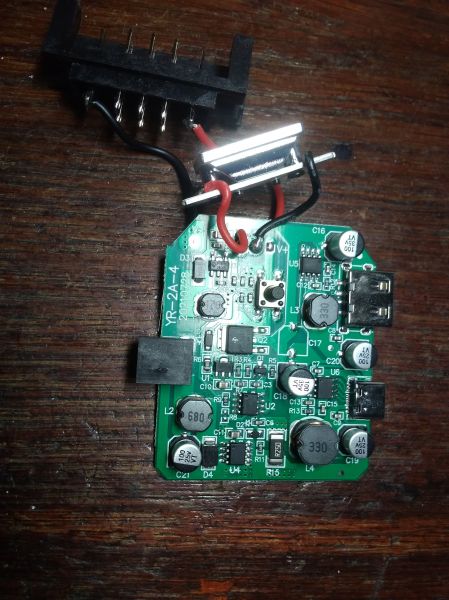 Я попытался вычертить схему его подключения. На рабочих адаптерах при нажатии на кнопку: - с 5 ноги идет сигнал 4.8В, который через транзистор открывает мосфет питающий контроллеры заряда на портах USB и понижающий преобразователь на 12В; - с 6 ноги также идут 4.8В, включающие LED драйвер для фонарика. Последующие нажатия на кнопку последовательно меняют уровни напряжения на 6 ноге (4.8В, 2.8В, 1,6В, 0В) для изменения яркости фонарика. На 5 ноге остаются стабильно 4,8В. Плюс видимо реализовано отслеживание потребления энергии и спустя какое-то время простоя мосфет автоматически отключается.