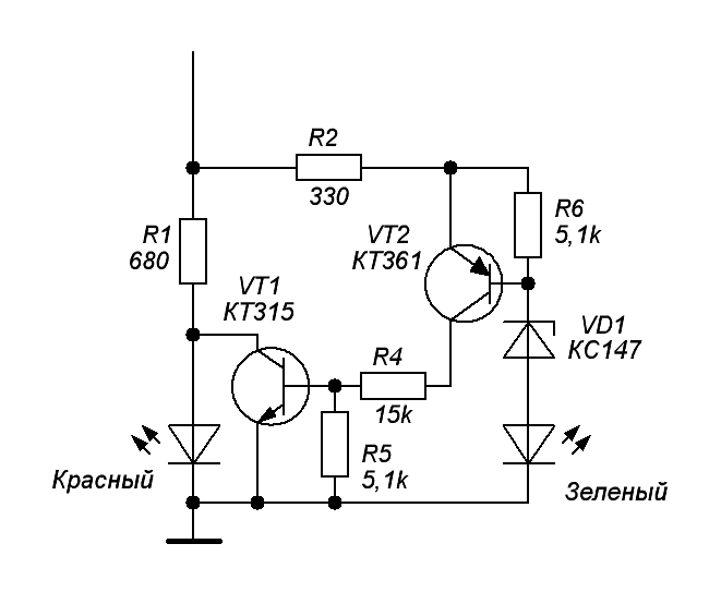 Здравствуйте, Гуру схемотехники! Помогите, пожалуйста, состряпать схему. На входе может быть только два питания: 5 Вольт или 9. RGB-светодиод должен гореть красным в первом случае и зелёным во втором. Заранее благодарен!