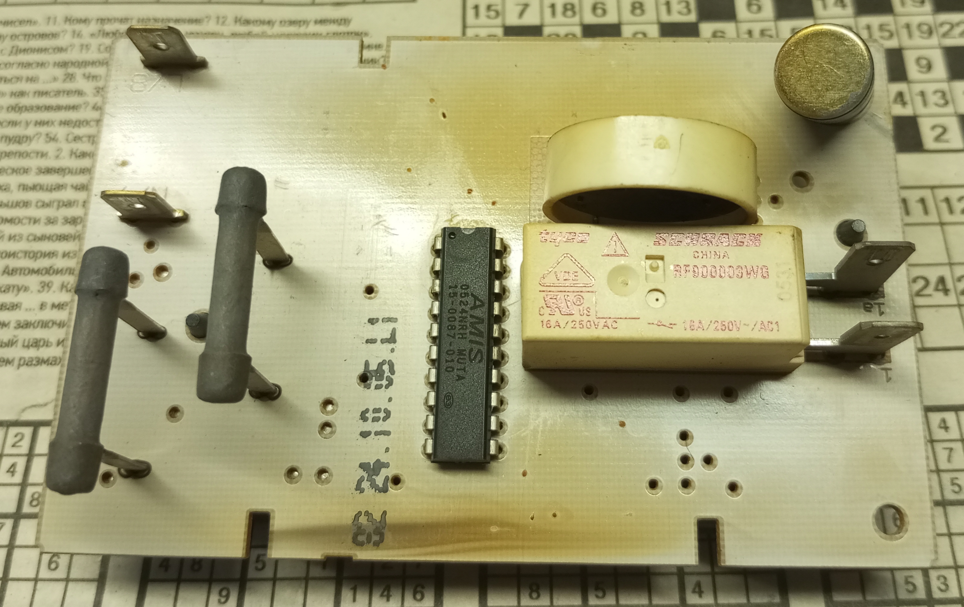 Чем запитать часы/таймер духовки EL2000/253.221 (Invesys D-78559). На входе 2 резистора около 7КОм, на выходе 22В переменки (как там что подсоединено не понял, но перемерив все ножки резисторов в разной комбинации тестером нашёл самое низкое значение).
