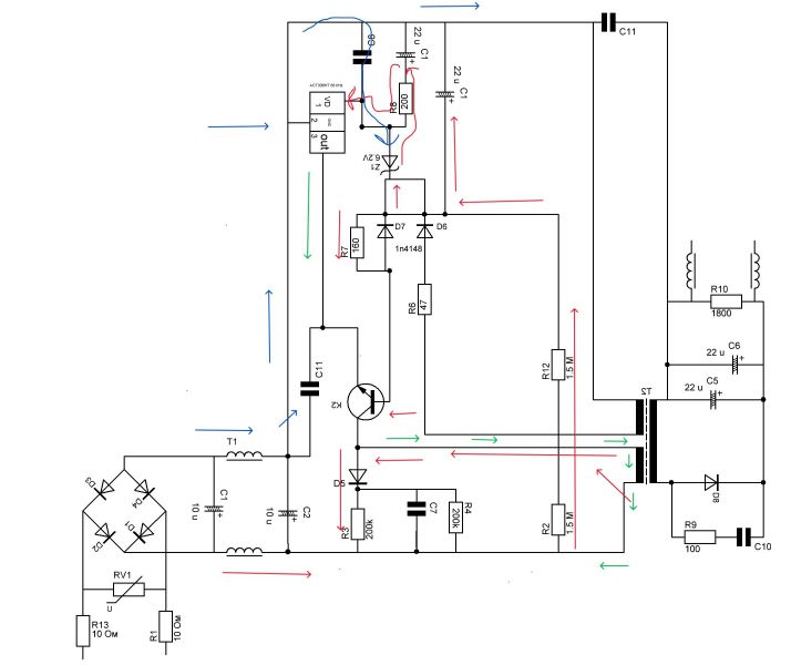 Я вот попробовал нарисовать стрелочками, синие это минус, красные плюс, зеленые это сигнал с шимки только до меня не доходит как все таки шимка получает питание, минус приходит на анод, плюс на катод, и эта же полярность должна и выходить только стабильная, (6.2 в нашем случае) допустим стабилитрон открылся и это фиксированное напряжение дошло до транзистора, через резистор упало только нормально ли так? по сути для открытия транзистора и надо 0,7 вольт, но человек писал, что это очень плохо какое вообще должно быть напряжение на транзисторе? ну ладно, возвращаемся к стабилитрону, он открылся и минус поступает на плюс шимки, что-то странное как она получает питание. еще мне непонятна функция диодов, они ультра быстрые, могу предположить что для защиты от обратных выбросов катушки, но пока не осознал если так и есть, как они работают тогда , если пойдет минус там где должен идти плюс, то диоды не откроются, но шунтирующий резистор пропустит на базу и транзистор закроется, что-то тут не то я там нарисовал стрелочки под углом это у меня вопрос, течет ли туда ток того потенциала, цветом которого изображена стрелочка? кстати, зачем на диоде 6 резистор 47 ом, чтобы какой-нибудь всплеск тока ограничить? в общем вопросов по схеме хватает вплоть от ,,куда ток телеч,, до ,,зачем здесь этот элемент,, пойду пока проверю кондеры, а то что-то мне не нравится что на них нет напряжения, если оно не появится, гляну цепь , может резистор в обрыве, простите что поздно отвечаю, учеба немного мешает, отвлекаюсь на курсовые (((