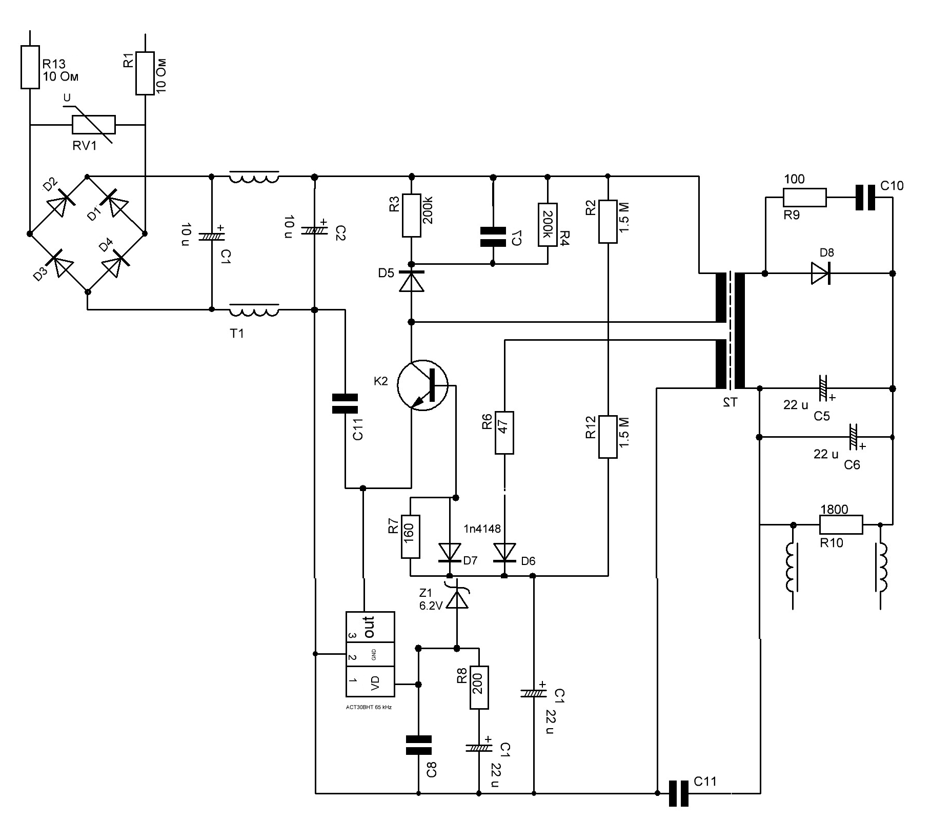 Здравствуйте, подскажите пожалуйста, я решил научиться разбирать электрические схемы, понимать как работать чтобы научиться чинить разные приборы, и решил потренироваться на блоке питания, перед этим я изучил элементную базу, но не в совершенстве, а так, базово, как элементы работают по отдельности, но нигде не нашёл видосов про то, как они работают в паре с другими элементами, какие там нюансы и подводные камни. Смотрел видосы в ютубе, на калале "диодов нет". История болезни блока : вскрытие показало вздутые кондеры, думал на этом все, поменял и готово, но тут все гораздо инереснее, был в обрыве резистор на входе, ну ладно, поменял. У меня тогда не было лампочки, я на страх и риск все делал, положил плату на пол, подношу щупы чтобы замерить напряжение и как бахнуло, я так понимаю потому что около ковра был, и когда поносил щупы статика как-то повлияла, я даже не успех коснуться щупами чего-либо, проверил потом вроде ещё и транзистор вылетел 13003,сменил, потом глаза стали убегать, я решил начертить схему, я её потом скину, и хотел узнать, какие диоды стоят, быстрые или обычные, пока выпивал обнаружил что там был один стабилитрон, который ушёл в кз и диод, который шунтирован резистором (кстати зачем?) тоже в кз. Я их поменял, ну и на всякий поменял другой рабочий диод, чтобы все одинаковые были, запустил Меряю напряжение на резисторах которые идут на базу, чтобы понять какое напряжение туда доходит ( хотя я не знаю какое должно, интересно было то, что когда я ставил красный щуп на конец резисторов а чёрный на минус мультиметр показал 0 вольт постоянки. А когда я черным до плюса дотронулся он показал минус 210 вольт Меня смутило то, что во первых я вроде как измеряю напряжение на одном потенциале, а не между двумя и то, что значение с минусом. Но минус я попытался объяснить тем, что на базу доходит меньше напряжение и относительно неё на плюсе потенциал больше а по воводу того, что на одном потенциале не понял прикола. На стабилетроне который рассчитан на 6,2 вольта почему-то 0,7 вольт, ну я так понимаю это напряжение идёт для открытия базы транзистора, но почему тогда не 6 вольт? Почему поставили стабилитрон не на 1 вольт скажем, Короче на базе 0,7 вольта, на коллектор эмиттере 200 вольт, и лампочка все время горит, ну она у меня светодиодная, маломощная, думаю ещё где-то кз есть, напряжения на выходе нет. А шимка act30bht.. Я посмотрел даташит, у неё первля нога плюс 6 вольт (скорее для неё стабилитрон) вторая минус третья вывод И я меряю, питание до неё не доходит, кондеры проверил на тестере компонентов 1,8 ЕСР, вроде норм и 22 мкФ Но не знаю, на них нету напряжения. Помогите пожалуйста прочитать схему, что куда идёт, до меня не доходит назначение элементов некоторых, буду искать ещё, но вдруг тут напишут
