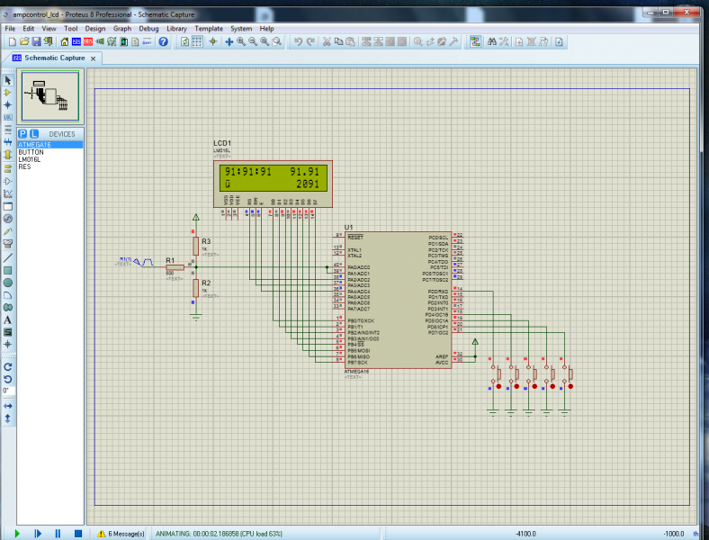 Всё-таки не выдержал, попытался добиться моделирования проекта на ATmega16 в Proteus.