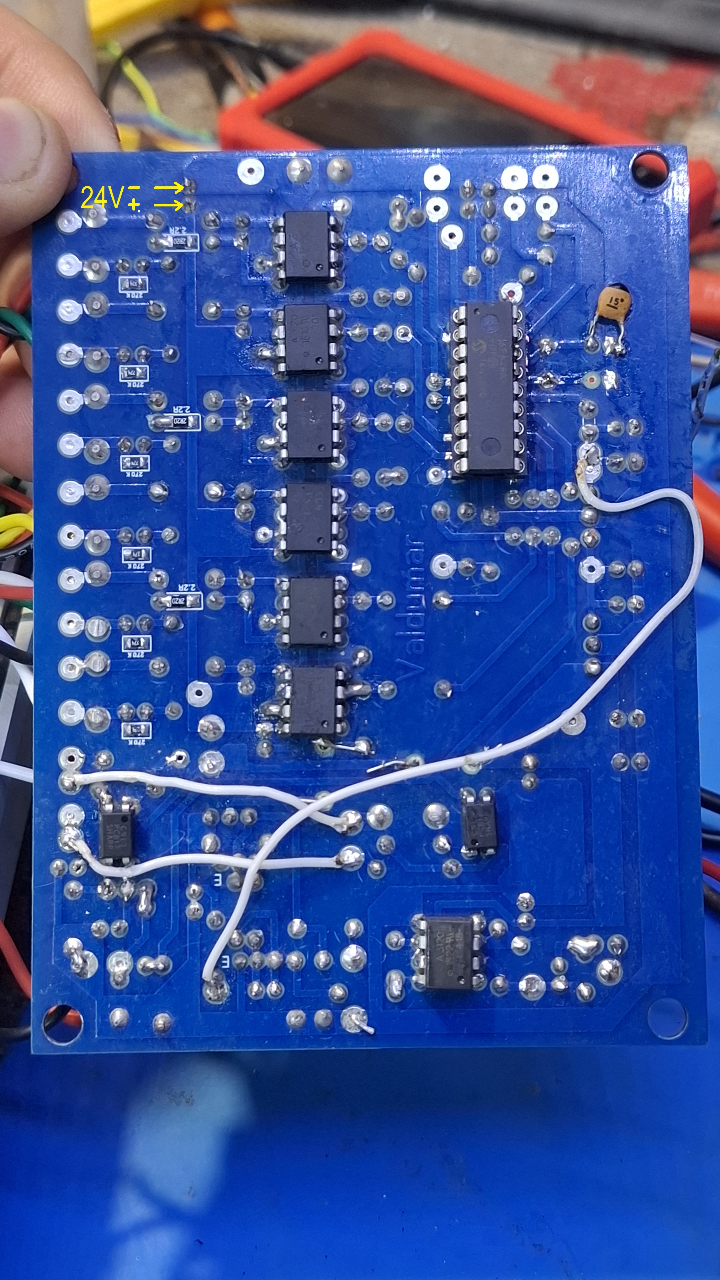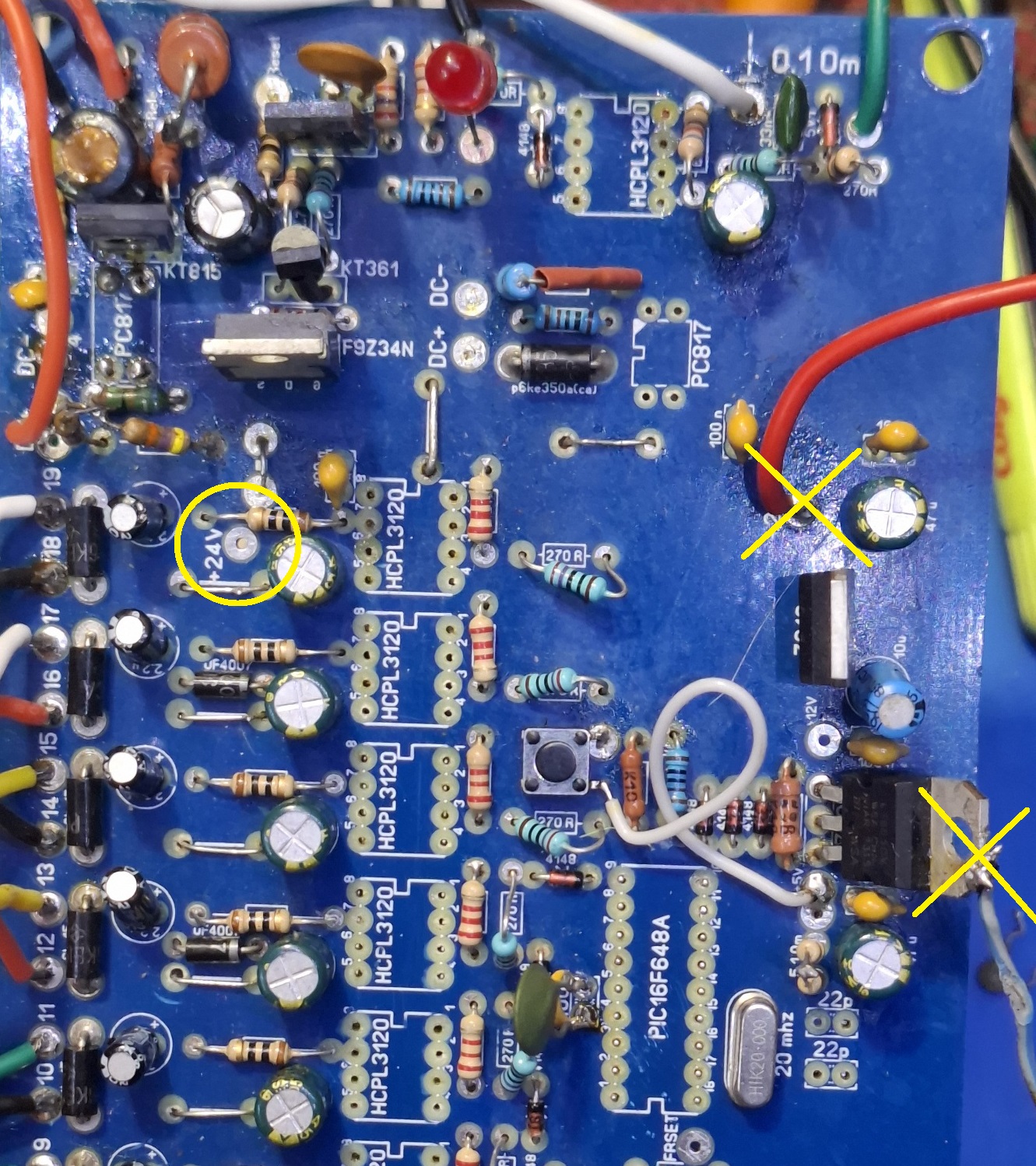 Конденсатора по питанию Cp (5-14 ножки микроконтроллера) не наблюдаю. И подвод 24В не в то место идёт, нужно ближе к драйверам 3120, а не в середину платы подавать. Где вы берёте такие платы, вывернутые через задницу, как у радикона?.. Этот конденсатор по питанию придётся прям к ножкам припаивать. И на кренки радиаторы нужны..А там какой-то провод прям к кренке припаян Резистор R23 10Ом странно выглядит, как подгоревший. Есть ведь нормальная рабочая разводка платы, просто под утюг, есть пункты проверки в Устройстве и наладке. Сделал правильно и сразу работает. Генерацию на кварце может срывать щуп, нужно смотреть с делителем 1:10.