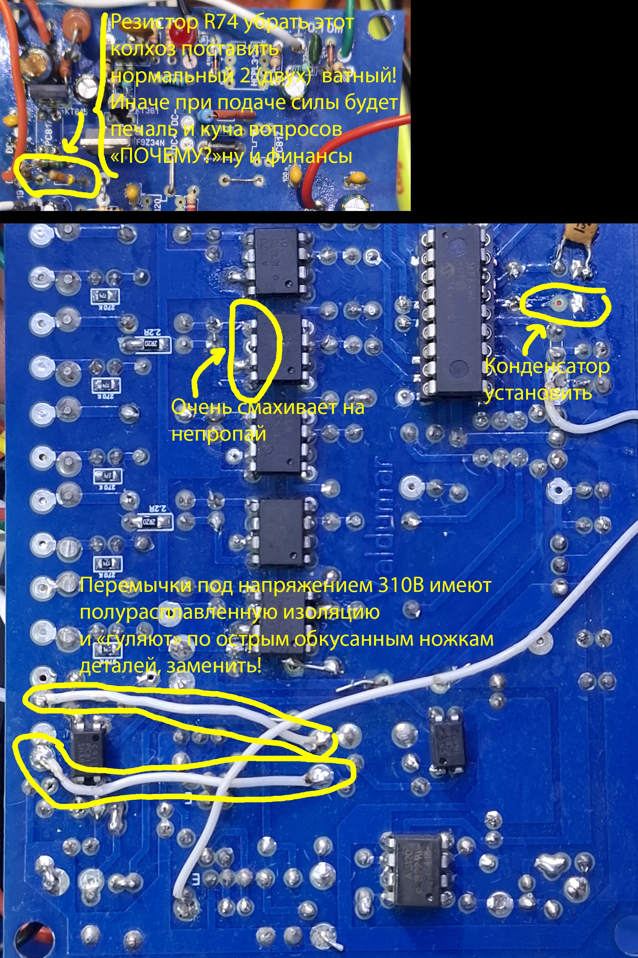 Конечно спасибо за советы. Но: на перемычки не обращаю внимания, т к силу не подаю, про кодер писал- пох, не пропай на 3120 да есть, но эта нога не используется... Резистор, да греется, заменю....