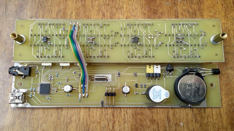 Такие же матрицы SZ421288K, и драйвера в dip корпусах как в часах из предыдущего поста Питание подаётся через miniUsb Один ds18b20 на плате, второй подключается через гнездо наушников 3.5мм dht22 и bmp180 не устанавливал