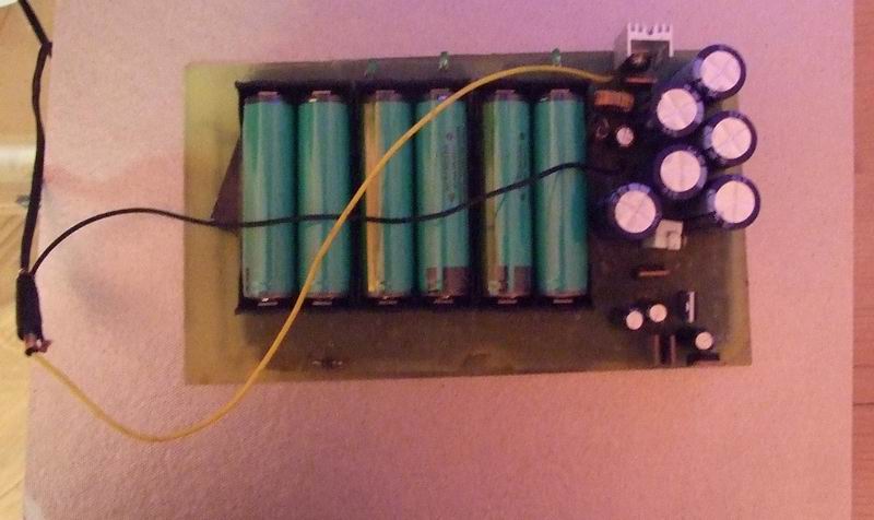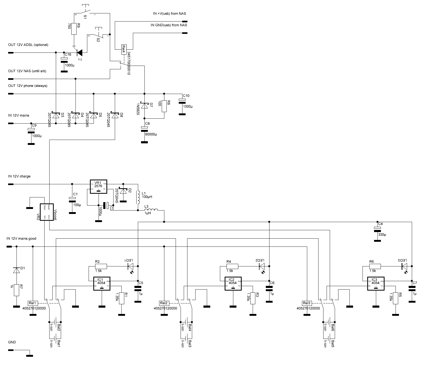 Вот вроде бы по памяти нарисовал правильно Внешний вид недоделанного изделия (релюшки еще не приехали, но зарядку протести успешно) Плата имеет размеры 11х18см и в будущем будет запихнута вот в этот вот суровый бокс (187x118x56). В принципе при желании в него можно всунуть еще 6 банок увеличив общую емкость по 12V до почти 12Ah (каждая банка на фото - 3.7V/3100mah) и если подвинуть светодиоды то тогда платка бустера (на фото ее нету, но она имеет размеры 44х68х14мм) все еще поместится внутри. Несколько ответов на вопросы (а почему?): IN 12V mains - это просто подключение к выходу БП IN 12V charge - это питание зарядки через упомянутую мной ранее релюшку, включающую или клевую подсветку в прихожей, или зарядку IN 12V mains good - это тоже самое что IN 12V mains, но пропущенное через встроенную в сам БП релюшку DC OK. Есть мнение что она сработает быстрее чем сядут электролиты на выходе БП. Далее - примененный бустер для 12В выхода может максимум 4.5A. NAS жрет 3А (ну на нем так написано). ADSL+ wifi router + свич - на каждом написано 1А, потому все вместе они оценочно жрут еще 3А. Само собой скорее всего жрут они меньше, но выходит что питать одновременно и NAS и остальные приблуды лучше не надо. Потому в схеме появляется Rel4. IN V/GND(usb) - это питание с USB выхода имеющемся на NAS'е. Оно пропадает если NAS выключается (в том числе софтверным путем), чем я и решил воспользоваться для коммутации Rel4. Общий алгоритм таков - пропадает свет - ИБП быстренько переключает релюшками батареи на бустер, питание с бустера начинает поступать на NAS. В промежутке NAS будет питаться исключительно от сурового вида батареи кондеров. На NAS'е крутится скриптик, который периодически (раз в минуту) проверяет состояние сетевого интерфейса и если обнаруживает отсутствие роутера - делает shutdown now, что его выключает, пропадает питание с Rel4, та переводит контакты на тиристор, но окончательное включение OUT 12V ADSL произойдет только если подойду я и нажму S1 А то вдруг никому инет ща не нужен - зачем зазря батарею высаживать. Ну а питание на DECT'овский телефон всегда выдается, поскольку жрет он 5.5V/100mA. Не жалко вобщем.