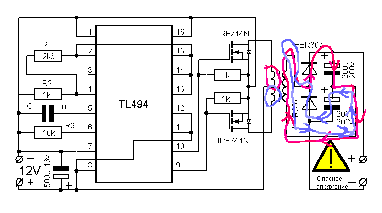 А в самодельном обмотки соединяют: начало однои с концом другой. И никак иначе. Иначе транс совсем не пашет. Обе обмотки мотаю одновременно двумя проводами для симметрии обмоток. Да и трансформатор всё же заряжает конденсаторы. Как же тут скажешь, что транс не работает или неправильно намотан?
