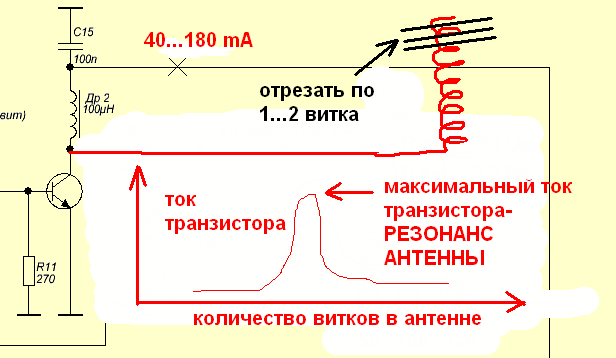 Еще раз... подключили антенну и отрезаете по 1..2 витку... при этом ток транзистора будет рости. При резонансе антенна имеет минимальное сопротивление. Значит ток ранзистора будет максимальным! (закон Ома... физика 7 класс))) ) . Будете дальше отрезать по кусочку антенну.. ток опять будет уменьшаться. Главное не отрежте лишнего)) , а то придеться обратно доматывать витки. Осторожно отрезайте по маленькому кусочку.