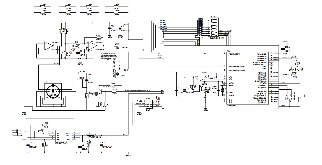 Начал делать второй вариант, т.к. модули питания (+24 и +5) у меня есть, и кроме т12 использовать другие жала не планирую. Немного упростил схему + индикатор у меня с ОА. Поэтому плата тоже получается своя.
