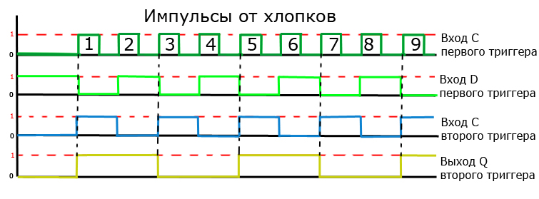 И ещё, Светлана, если несложно, посмотрите, вот я нарисовал диаграмму импульсов, следуя логике работы триггеров , верна ли она? Получается, что первые три хлопка не в счёт( устройство включается сразуже после первого), а на двойные хлопки начинает реагировать только с пятого хлопка???