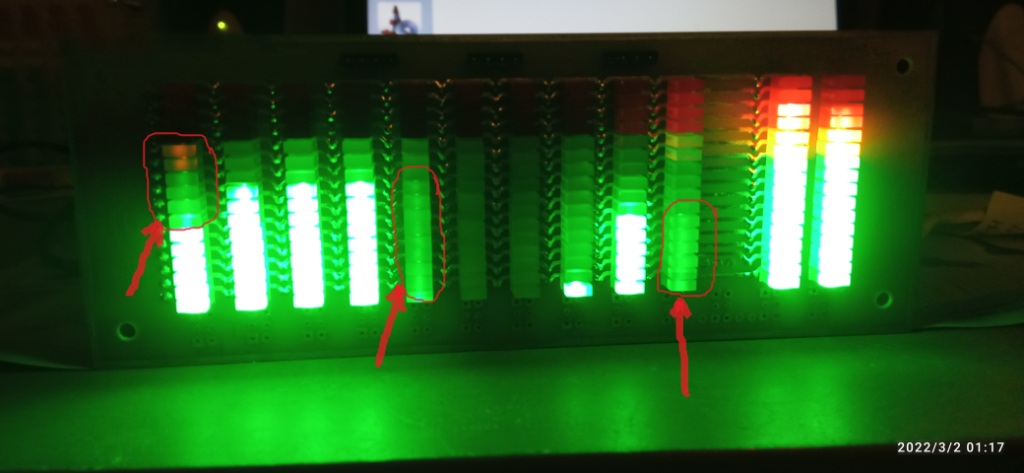 Выпаял транзистор с 11-го столбика и впаял в 1-й столбик, а с 1-го столбца транзистор впаял на место 11-го, поменял местами,- ничего не изменилось, если бы была проблема с транзисторами (VT17-VT28) на которых катоды светодиодов, то диоды в столбиках светились бы все, от 1го до 16го постоянно, когда пауза между песнями, то в матрице ни один диод не подсвечивается, но как появляется сигнал начинается вот такая свистопляска, полутенью диоды также "прыгают" и сильнее всего видно именно в 1-ом столбце, в остальных поменьше, но видно ( не во всех) а 11-й и 12-й столбцы хорошо работают, в них нету подсвечивания такого. Светодиоды у меня китайские стоят, очень яркие зеленые, но сегодня на них еще больше резисторы в строках перепаял - на 330 Ом, стояли на 220 Ом, это тоже ничего не изменило, ну просто чуть меньше видно подсвечивание. В общем уже голову сломал, в чем проблема. Анализатор очень нравится, хочется добить эту проблему, найти причину...И что интересно, когда в муз. треке тихо музыка играет, то видно только как полутень "прыгает" а как музыка громче, то как-бы прорывает и диоды в столбике в полную яркость сразу вспыхивают..пайка вроде везде нормальная. Прикрепил еще фото с дефектом.