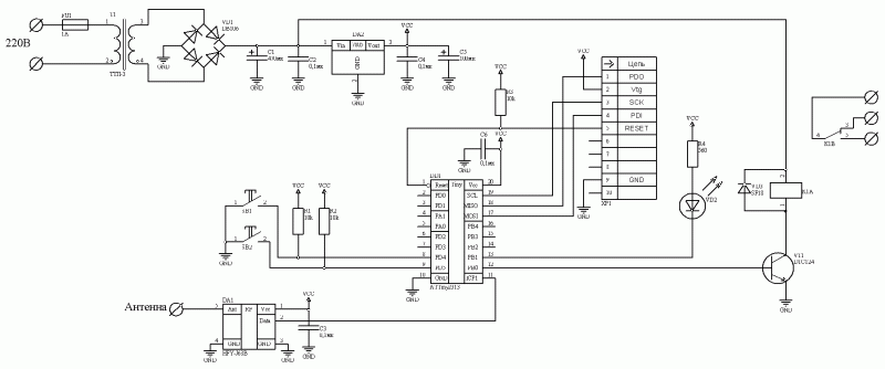 А для тех, кто дочитал до конца, представляю "упрощённую" версию радиорозетки на обычном реле и Attiny2313