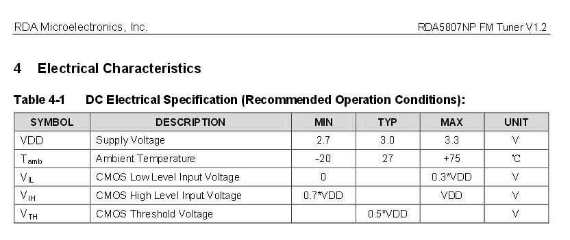 Черт! Запутался в буквах. Для RDA5807FP действительно 2,7...3,3 В . А я даташит оказывается смотрел для RDA5807SP в корпусе SOP16. И при этом максимальное напряжение на шине Vdd+0.3V, то есть 3,6 В.