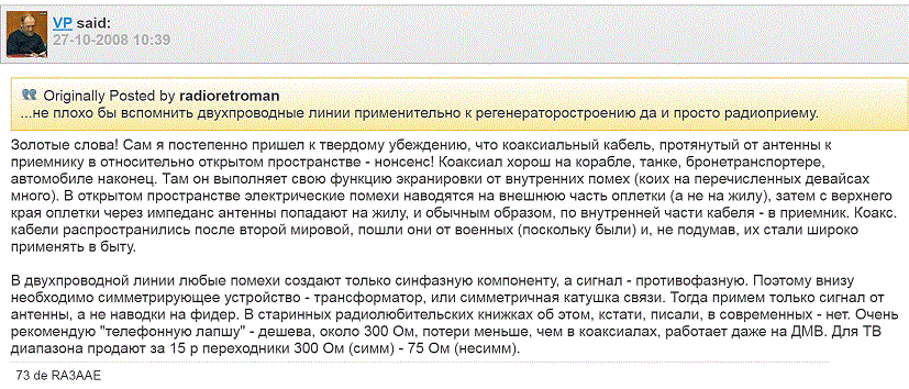 Добавлено after 7 minutes 19 seconds: А в городских условиях , при нынешних шумах , сильно чувствительный приёмник без хорошей направленной антенны с КУ хотя бы 5-10 дб по моему ни к чему. Шум дома глушит всё. Хотя бы забалконная верёвка на дерево .