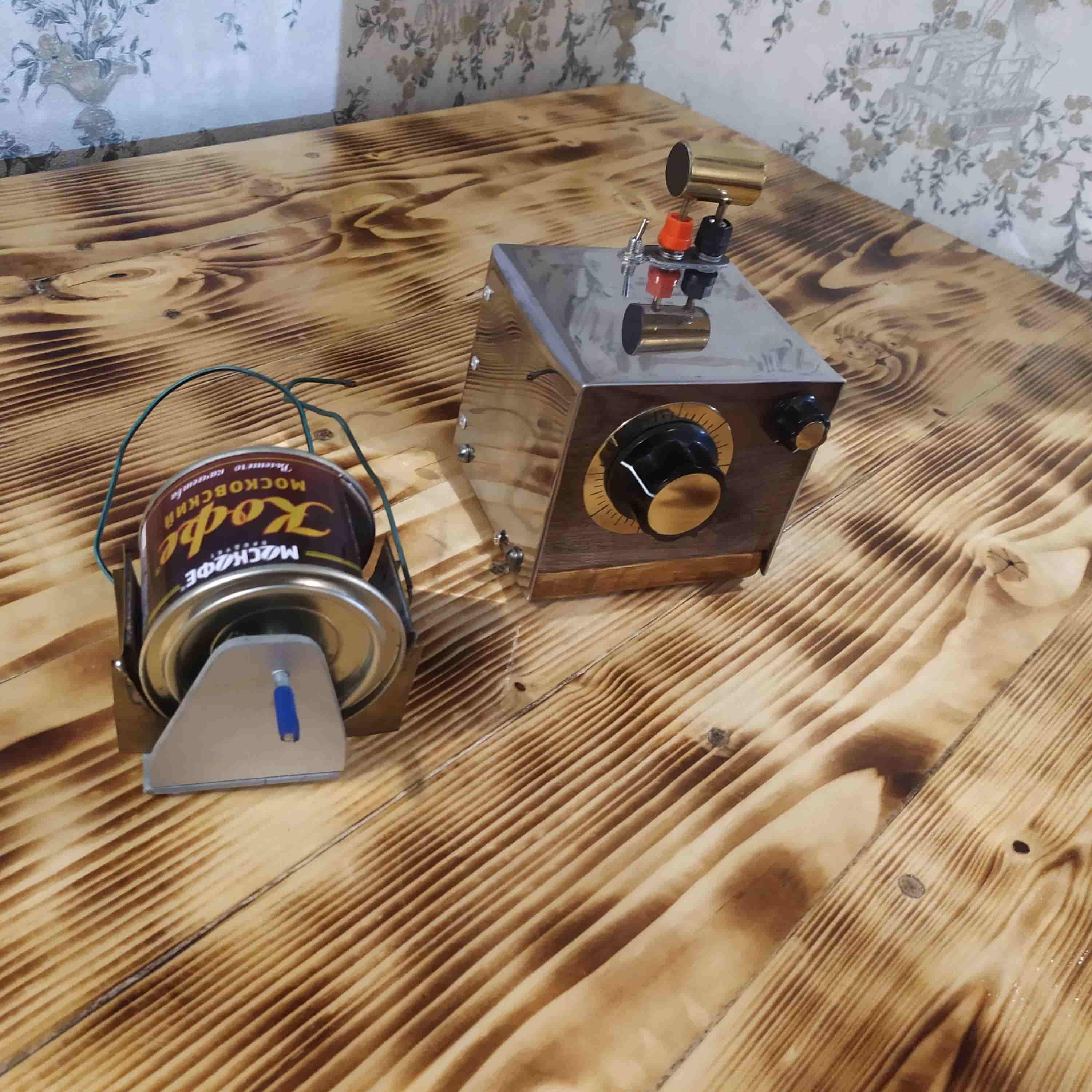 Приемник Ванюша. Кпе выполнен из банки кофе, катушка обратной связи отсутствует. Решил вынести катушку из корпуса, для удобства ее замены, ну и корпус металл.. приемник меньшего размера сделал без КПЕ, подстройка осуществляется движением ферритового стержня в катушке сверху приемника. в итоге только ручка регенерации. приемник при хорошем прохождении ловит 80метров на отрезок провода 20см. сделал несколько катушек-приставок, экспериментирую