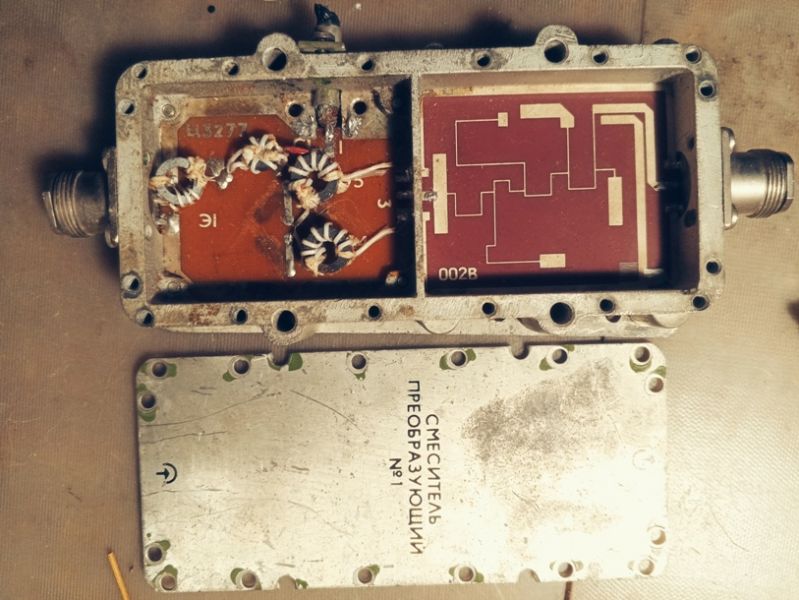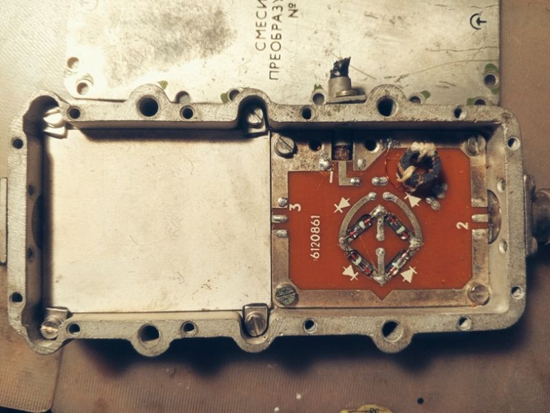 Тонкая линия это L элемент, а квадратик (прямоугольник) это С элемент. Последовательный LC контур. Слева в конце делитель 3 дб, с него идёт симметричное возбуждение на катушки в следующем отсеке, смесителя похоже на диодах. Сделано на керамике свч 22ХС.