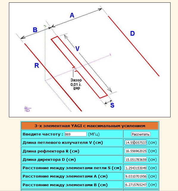 По вашей ссылке плохие отзывы. При расчете этим калькулятором на 869 МГц элементы слишком длинные, на несколько сантиметров длиннее чем готовое элементы на более низкие частоты телевизионных каналов показанной мной антенны. Этот калькулятор похоже не верный.