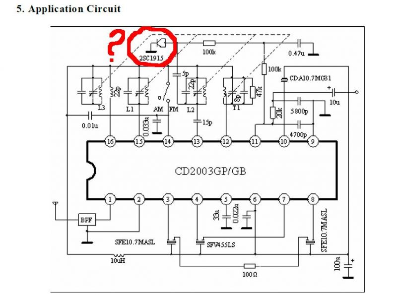 Уважаемые товарищи! Не подскажите, что за странное подключение транзистора 2SC1915 в схеме даташита для чипа CD2003 (радиоприемник AM/FM)? Эмиттер с коллектором накоротко замкнуты, база замкнута непосредственно на минус - для npn-транзистора... По крайней мере, я так разглядел. Странный фрагмент обведен на схеме красным.