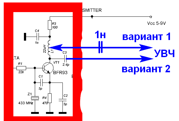 Получим автотрансформаторное согласование. Это вариант № 1 на схеме. Можно припаять пигтейл к коллектору транзистора через маленькую ёмкость. Это вариант № 2 на схеме.