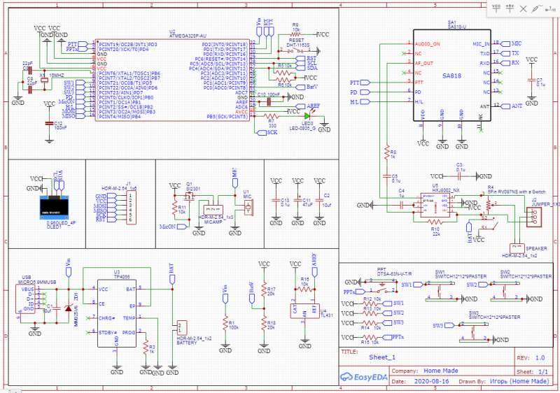 "Мозги" - Atmega328P. + OLED дисплей для отображения работы, настроек и заряда аккумулятора. Питаться все будет от Li-ion аккумулятора на прямую так как и Атмега и SA818 спокойно будут работать от аккумулятора вплоть до 3.3 вольт и ниже. Дисплей подключается по I2C. SA818 подключается по UART (пины PD0 и PD1). Один из моих косяков - я не предусмотрел вывода отладочной информации. Ну либо как-то на прямую подключаться к микроконтроллеру и организовывать программный Serial. Но это вряд ли буду делать, так как МК распаян под дисплеем, к нему не подлезть, только снимать дисплей. Управление SA818: PTT (включение передачи) - PD3 PD (Power Down) - PB0 H/L (переключение мощности) - PB2 В принципе больше ничего особенного. Зарядное устройство на TP4056, аудиоусилитель на HXJ8002, 3 кнопки управления, подключенные к пинам PD5, PD6 PD7, и одна кнопка "Передача" - PD4. Так же для измерения напряжения на аккумуляторе установлен резисторный делитель и опорное напряжение на TL431. Хотя, если подумать, большой точности не нужно, ножно было бы использовать внутреннее опорное напряжение в 1,1 вольт. Ну, так или иначе TL431 установлен, и имеем опорное напряжение в 2.5 вольт.