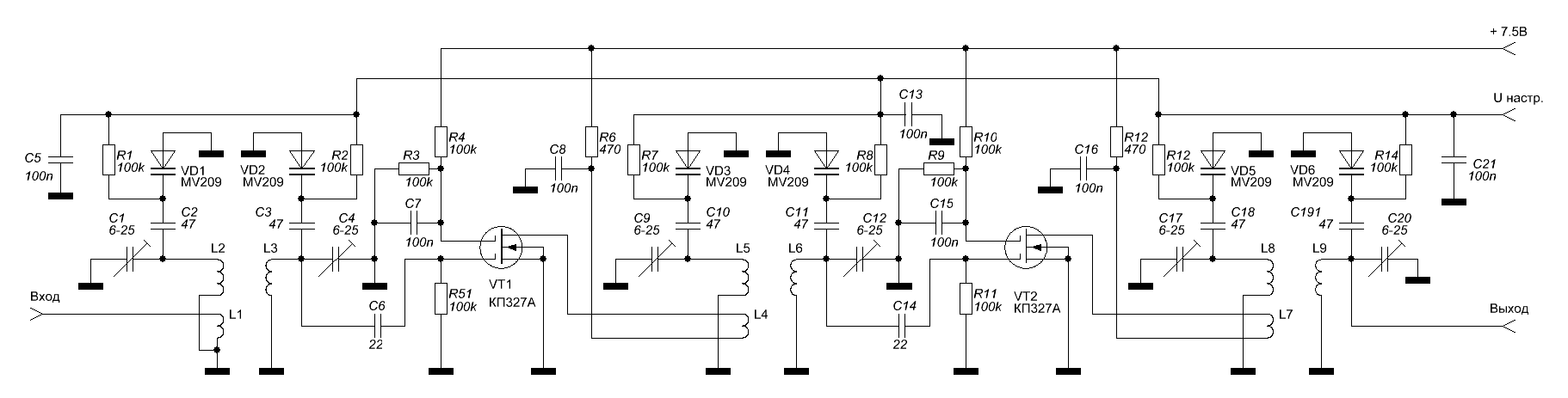 Эта тема вроде уже поднималась годах в 80_х в журнале Радио. Листая старые подшивки натыкался на что-то с широкополосной преселекцией и регулированием усиления УВЧ по сигналу с УПЧ (еще до ограничения), во избежание превращения радиовещательного УКВ приемника в шарманку. Недавно искал ту статью, да чёта не нашел. P.S. Возможно ошибаюсь, и статья была не про широкополосную преселекцию, а про широкополосную АРУ для УКВ ЧМ радиоприемника. Но что-то интересное я там определенно видел. P.P.S. А "гирлянда" из контуров с варикапами ни к чему хорошему не приведет в условиях плотной заселенности диапазона. Давно проверено всеми кем только можно и отвергнуто как малопригодное.