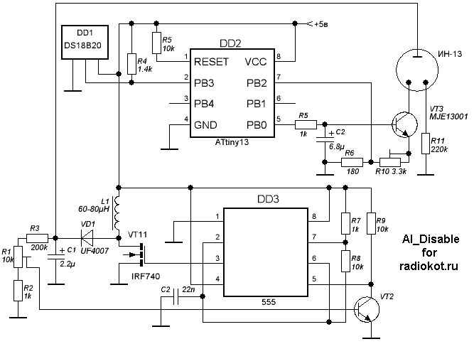 Ну вот, наконец, закончил свою версию термометра на ИН-13. Схему упростил, избавился от ОУ, заюзав АЦП тини13. Благодаря чему плата получилась очень простой и компактной. Это также облегчило калибровку и увеличило точность. Питание - 5в от ненужного зарядника от мобилы. Во вложении схема, прошивка, плата Sprint Layout 5 (Последовательно 7-й ноге тини13 - перемычка. Верхняя деталь, в корпусе TO-92 - 78L05). Перед прошивкой нужно удалить перемычку и, желательно, 555, после - всё вернуть на место. Транзистор VT2 - любой npn(например кт3102), я утянул какой-то SMD с материнки. Питать можно 7-18в. Если питать от 5в, то вместо 78L05 ставится перемычка между крайними выводами. Есть 3 версии прошивки: для уличного термометра от -50 до +50, для комнатного от 0 до +50 и от 0 до +100. Настройка очень проста: включаем термометр, теперь, как можно точнее, в течение 20сек, устанавливаем шкалу на минимальное значение, с помощью R12. После 20сек, шкала погаснет на секунду и снова загорится, теперь устанавливаем её в максимальное положение. Ещё через 20 сек термометр запомнит результат и перейдёт в рабочий режим. Если вам не хватило 20 секунд, чтоб всё точно настроить, обесточите термометр, разрядите конденсатор по питанию или подождите секунд 20 и повторите сначала. Настраивать нужно только один раз, после перебоя питания, если не трогать R12, в силу войдут сохранённые ранее настройки. Перед запайкой МК советую настроить преобразователь. Значения индуктивности дросселя такие: питание 5в - 70мкГн, 10в - 100мкГн, 15в - 150мкГн. Есть идея сделать улично-комнатный термометр: добавить ещё один DS18B20 и двухцветный светодиод , в качестве подсветки индикатора. Когда подсветка синяя - отображается уличная температура, когда красная - комнатная. Также можно избавиться от преобразователя и БП, просто запитав схему от сети, МК и датчики – через гасящий конденсатор, индикатор – через резистор. Развязка, в данном устройстве, не к чему, да и получится гораздо компактнее. Если кому-то нужны исходники стучите в аську. Всё вроде. ---------- Схема пофикшена 13.04.2010 UPD: Тактирование МК 4,8Мгц!