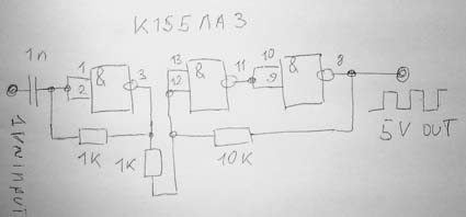 К155ТЛ1 (соединил 1,2,4,5 (на них вход) выход 6, 7 -земля, 14 - 5В) К155ИЕ2 (вход 1, выход 11, 10 - земля, 5- 5В) К155ИЕ2 (вход 14, выход 11, 10 - земля, 5- 5В, 12 соединил с 1) Где я лоханулся?