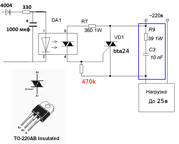 банка в народе кондел литик -по форме-банка и естьр при запитке реле постояного тока через мост изза высокойиндуктивности банка не нужна а для тиристора она -зло! но если вашн реле расчитано на переменку питать его постоянкой -опасно оно может перегреваться или залипать вобщето твердотелки для управлением мех реле ползуют редко при вашем реле -симистор на 24а лишняя деталь оптрон зам может рулить таким наверняка триаку мало тока для удержания вашего реле (13к) ! он у таких деталек сотни ма! выход наапрашивается такой -мост и банку доло1! триак вта 24 убрать резики R2R3 ТОЖЕвыход ОПТРОНА подключить к клемам Х2 тоесть так