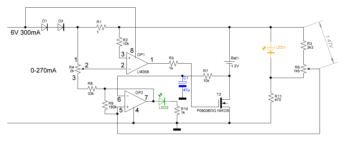 ИМХО, если совсем нету деталей, то тебе разве что источник тока на каком-нибудь КТ805 из стоящего в сарае телевизора могу посоветовать...