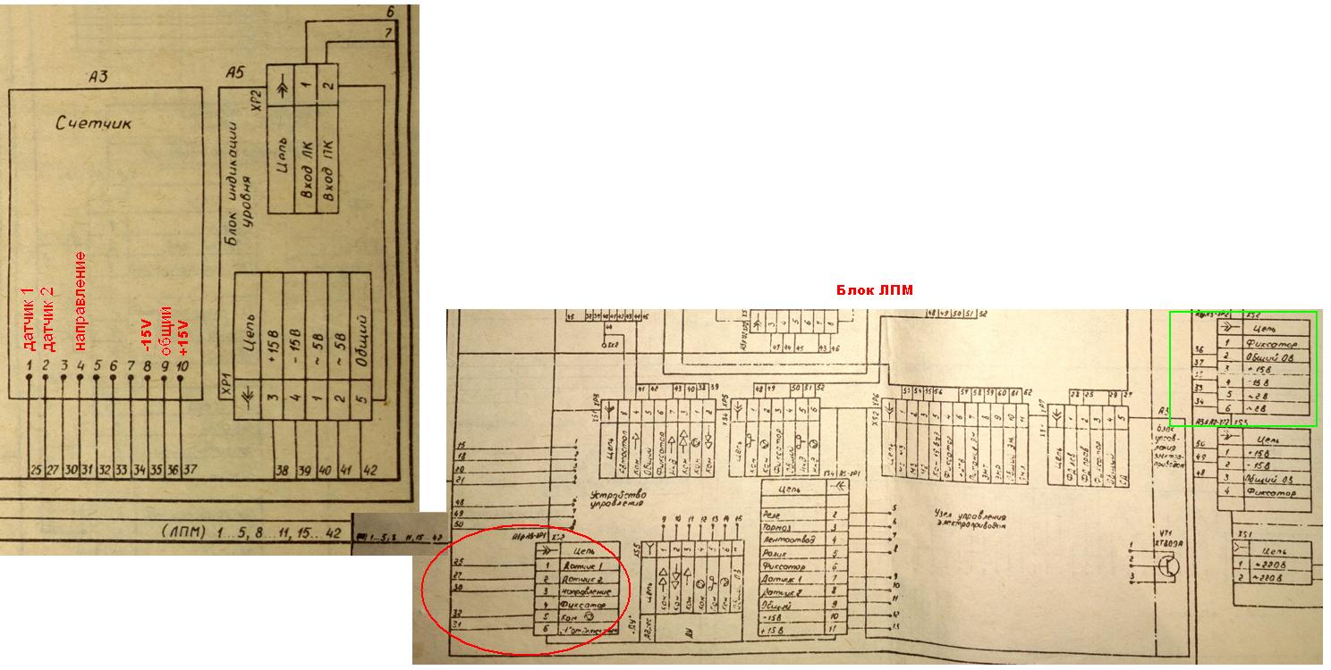 А напряжение с Датчика1 (-0,5V) приходит, когда магнитофон в режиме воспроизведения и оно не меняется? А если подключить мультиметр к XP1/XS2, контакт1 (Датчик1), включить магнитофон, что покажет мультиметр? Потом немного повернуть приемный подкатушечник. Изменятся ли показания. Еще можно прозвонить светодиоды АЛ107Б и фотодиоды ФД-256. Посмотрите также цепь правого фотодатчика на схеме во вложении (выделена красным цветом).