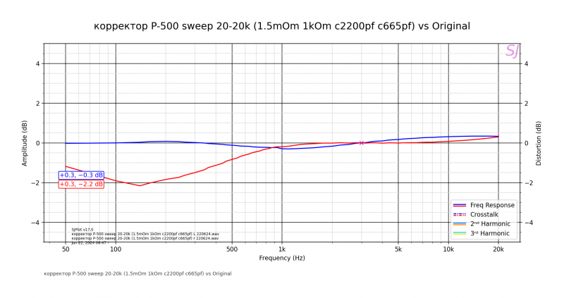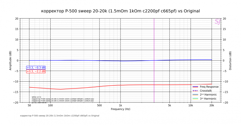 На плате написано PHONE, что как бы намекает на наушники. Попробовал впаять параллельно резистору 3.3 кОм - 1кОм, это добавило ещё где-то 12-15 дБ. Нашёл схему с номиналами близкими к номиналам схемы коррекции, там тоже 1 кОм. АЧХ у этого корректора с подъёмом в районе 1кГц на 2Дб, после впайки появился ещё завал по низам -2дБ.