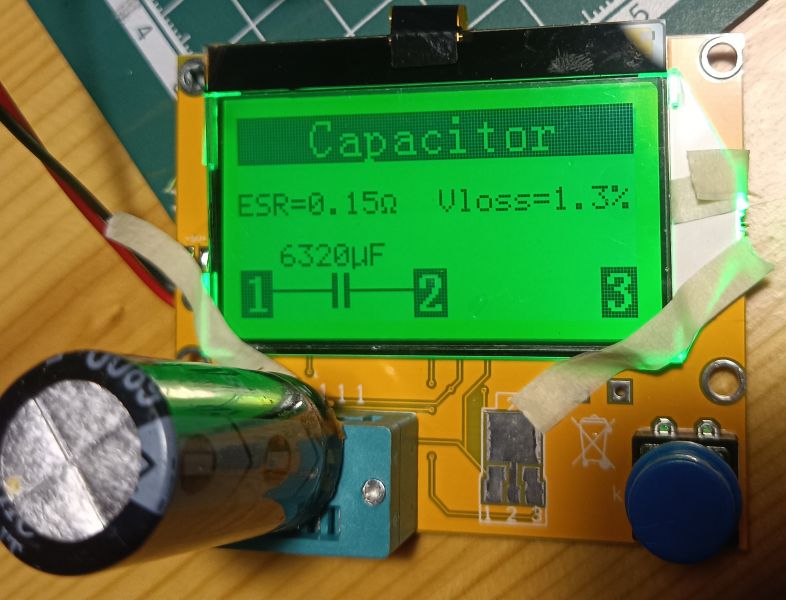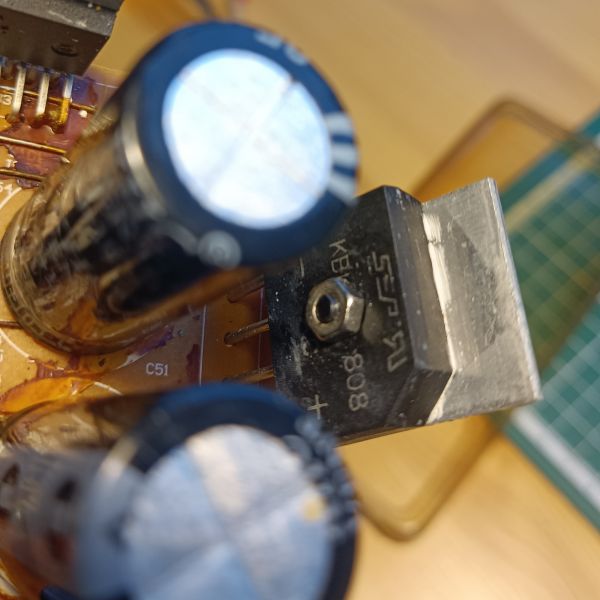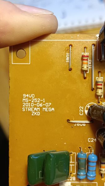 Визуальный осмотр не выявил криминала, мной были выпаяны и проверены два больших конденсатора на соответствие ёмкостей и запаяны обратно. Текстолит был обильно промыт от окислов изопропиловым спиртом.
