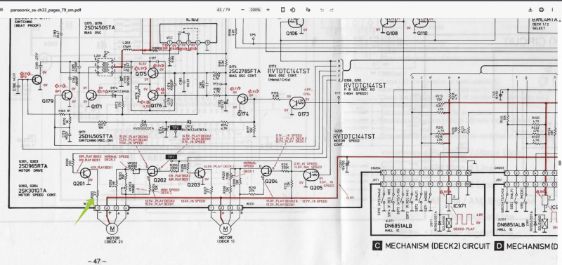 Не работает второй карман, с первым всё хорошо. Спасибо за наводку, буду пробывать. Двигатели оба рабочие, проверял. P.S. Замкнул Э-К транзистора Q201, тот же двойной щелчёк электромагнита, двигатель не заработал. Подключил к разъёму W202 другой двигатель не связанный не с каким механизмом, включаю плэй, двойной щелчёк электромагнита и непродолжительная работа двигателя.