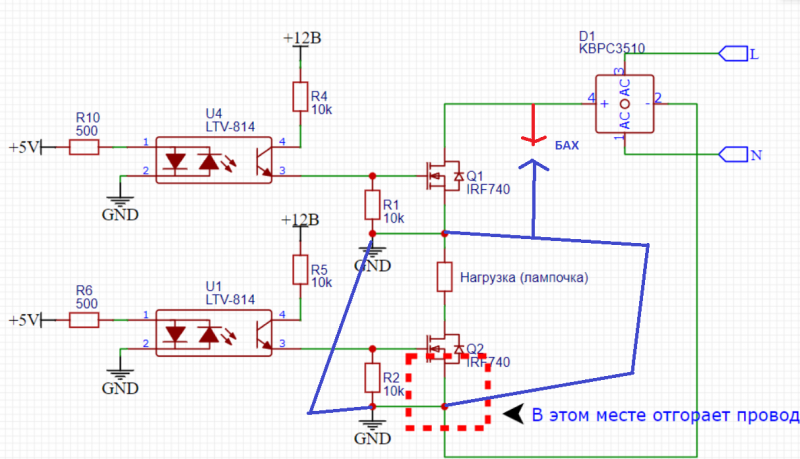 Добрый день! Не могу понять, почему горит MOSFET (на схеме выделен). При питании нагрузки от +3В все работает. Когда подаю напряжение от диодного моста на лампочку (220В), нижний мосфет с грохотом горит. Подскажите, пожалуйста.