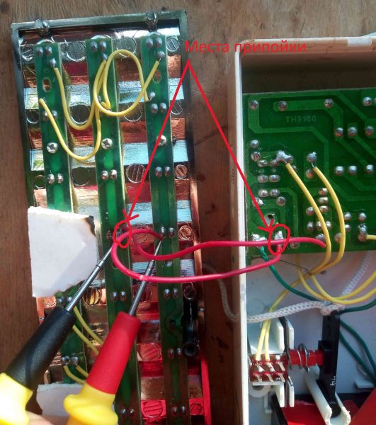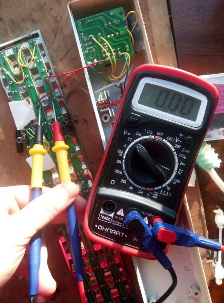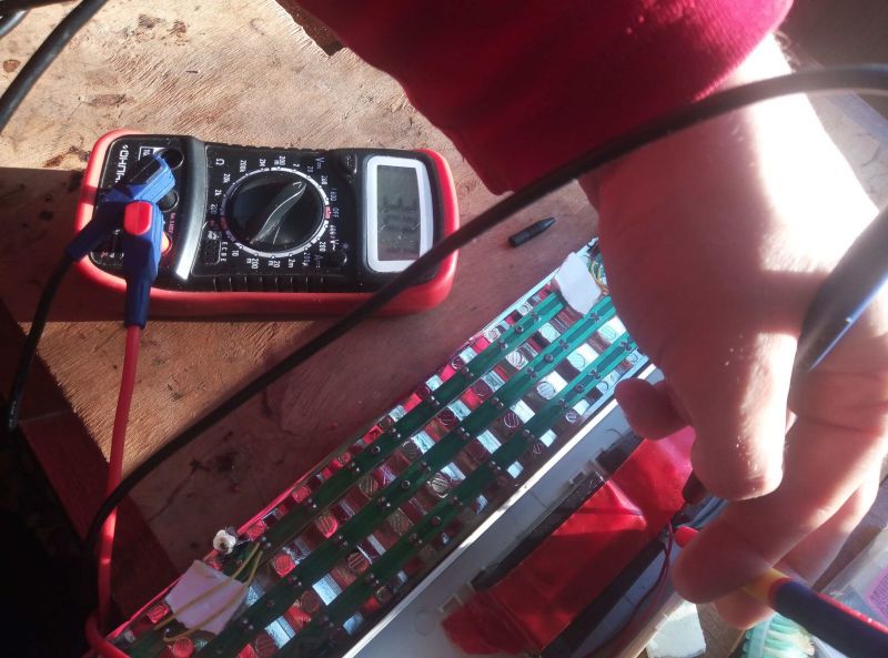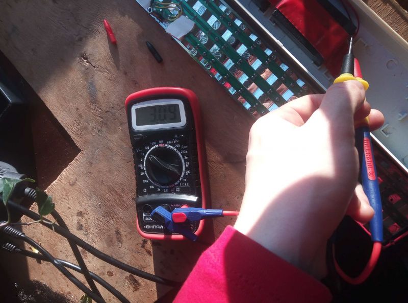 На фото замеряю напряжение на + и - контактов LED-панели - 0 В. Места, которые я припаял, видны большими каплями олова, кроме зелёного провода, туда я дополнительно напаял, усилил. Напряжение на батарейках уже упало до 3,07 В. Может я неправильно припаял? Может надо наоборот?