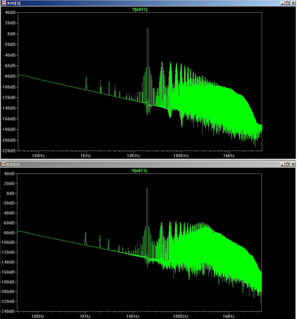Интермоды JLH. Частокол из комбинационных составляющих и пушистый лисий хвост с очень большим уровнем. Режим моделирования 19+20 кГц, амплитуда выходного напряжения примерно 12 В. Использованные модели транзисторов BC556B, BD139, 2N3055 от On Semiconductor. Напряжение питания 27 В, Rн 16 Ом.
