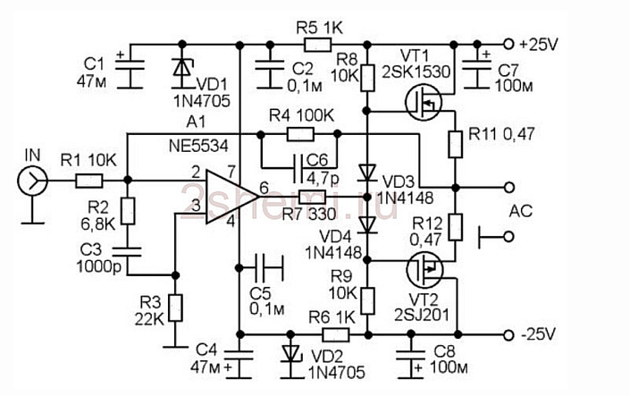 Сначала надо задаться вопросом, для чего это всё собирается? Если "дома послушать", то начинать надо с типовой схемы включения 2050. Играет она лучше чем 2030, а главное не такой утюг уже изначально. К тому же будет референс для сравнения на будущее. До 25 Ватт, (если не китайская подделка конечно) 2050 раскачивается легко. При вполне сносных искажениях. Если пользовать 2050 как высоковольтный операционник, то лучше купить высоковольтный операционник. |