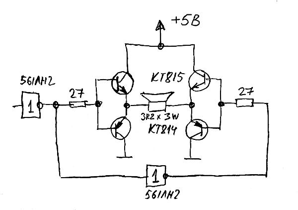 Добавлено after 14 minutes 12 seconds: соответственно, чтоб сие зашевилилось несколько громче, надо изменить включение DD1.5 и DD1.6 + добавить еще пару транзисторов. Желательно мощных составных, так как ток по ним попрет в районе ампера. И если поставить обычные 814/815, то приедет микросхема, так как ток через нее будет больше 12ма/выв, а надо 1