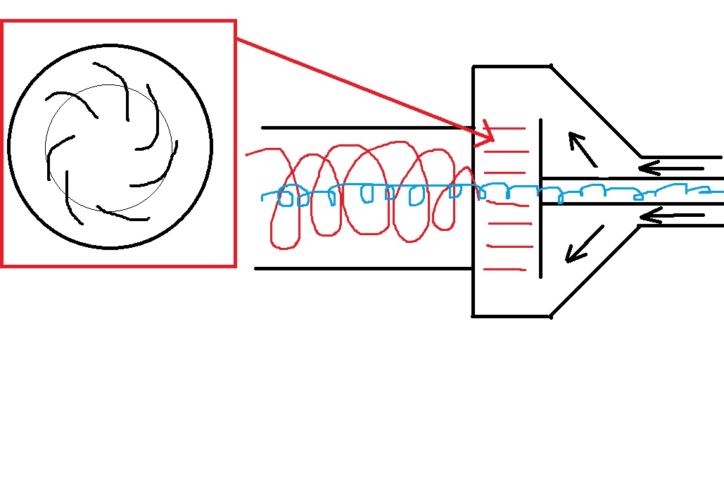 Когда написал последнее сообщение, уже начинал догадываться, что ваша схема отражает не правильный метод впуска воздуха. А точнее она вообще не отражает. Я понял, все эти атмосферы необходимы для создания кинетической энергии вихря. Колхозная улитка самоделкина из видео, направлена как раз на создание завихрения. У него, насколько я понял, там просто улитка без лопастей, без ничего, просто с вырезом. (Что то более продвинутое сложнее изготовить дома, оно понятно) но у этого решения есть недостаток. Энергия от входа неравномерно закручивается. Точнее поток не проходит почти полный круг по улитке, равномерно расходуясь по радиусу. Из этого могу сделать вывод, что вероятно жгут в его трубке, начинает сильное завихрение в месте улитки, где осуществляется подвод, и практически никак не завихряется от середины пути воздуха в улитке до конца. Так как воздух вынужден еще и отходить вбок, по трубе, то жгут будет больше напоминать форму растянутой пружины. А в идеале я так понял он должен идти соосно трубе. Естественно это нарушает разделение температурных слоев.