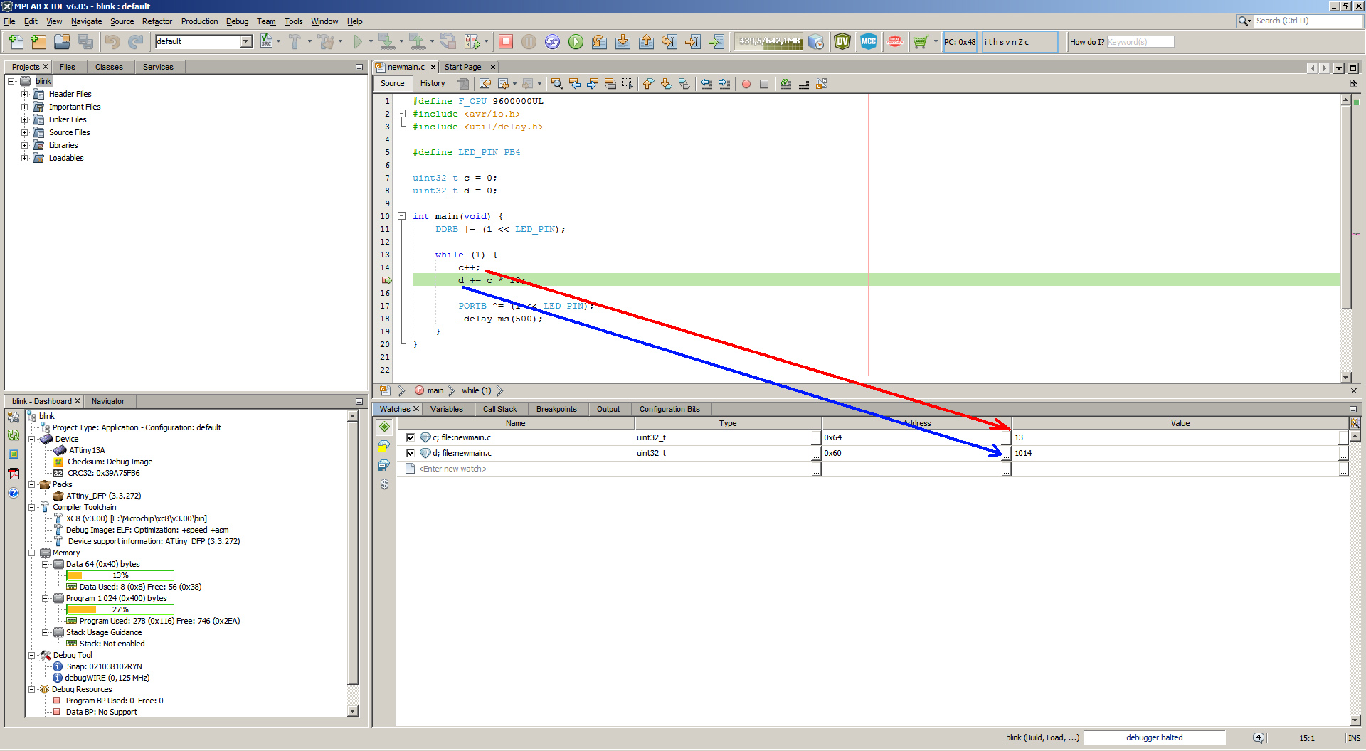 В старых МК AVR нет хорошей отладки, вроде как нужен программатор-отладчик. В программе для этого должны быть встроены соответствующие команды. Насколько понял, для новых МК AVR мало у кого есть программаторы, вроде как программатор тоже нужен. У новых МК есть много преимуществ, использовать старые Tiny не имеет никакого смысла. Кому нужна программа, если программатора нет.