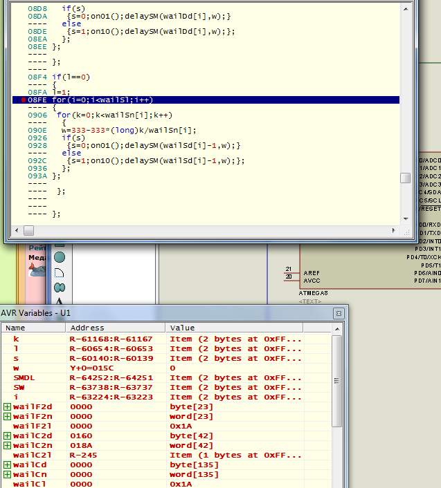 А протеус то не знает... И более того позволяет отлаживать прошивку. Показывая все переменные с именами как на Си, регистры и порты. И точки останова есть.