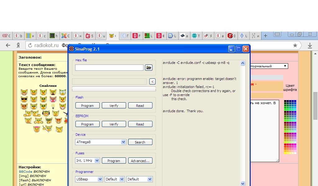 Всем доброго времен суток.Заказал себе сие чудо с китая,сроки подходили к концу и чуда не произошло.Решил собрать себе его сам.Так как до этого пользовался STK200-300 решил делать под его переходники. В итоге было собрано 4 штуки,две заработали сразу ,две чуть позже(основная причина непропай ножки меги 8 ).В результате заработали все 4. Два аппарата ушли к друзьям.Не знаю почему у многих проблемы с определением, у меня такого не наблюдалось. Два экземпляра работают на моей 32 стационарной машине, и 32 нетбуке. У друзей же на их 64 ноутах тоже пока без нареканий.Правда юзались только мега 8, мега 16 и тинька 13. Единственное,на большой скорости не особо стабильно работало временами.Но даже на маленькой скорости было быстрее чем на STK 200-300. Чуть позже как и следовало, после сборки,чудо с китая приехало. И выяснилась разница в работе- китайский вариант ни как не реагировал на джампер скорости,шил в два раза медленнее большей скорости самодельного,но шил стабильно,и фьюзы немного отличались.В итоге прочел его прошивочку и благополучно посадил на один из мною собранных. Две недели пользования-полет нормальный. Кстати использовал стабилитроны не smd варианта,обычные 3,6в. 0,5вт - BZX 55C.Просто отформовал ножки,и вместо джамперов подачи питания и переключения скорости, использовал переключалки планарного типа,удобнее получилось.Джампер для прошивки ставить не стал,пользовался простой проволочной перемычкой. На фото слева китайцы,справа мои варианты,печатка,вид на стабилитроны и переключатель,в центре переходники под тиньку 13 и мегу 8 , сверху доктор авр фьюз(к делу не относится "нечаянно попал в кадр" ) Выкладываю архив того что у меня работает,может кому пригодится. В архиве печатка моей версии USBasp, плюс печатки плат переходников под тини 13,2313,26, под мегу 8 со стандартной кроваткой и под мегу 8 с широкой панелью нулевого усилия как на фото,так же под мегу 16. Две прошивки под мегу 8 - одна которая имеется на просторах интернета,вторая слитая мною с китайца. Ниже выкладываю скрин фьюзов китайца,различие не большое, Но думаю многие согласятся что галочку с CKOPT лучше убрать как и рекомендовалось в предыдущих постах. Надеюсь кому то мой пост будет полезен.