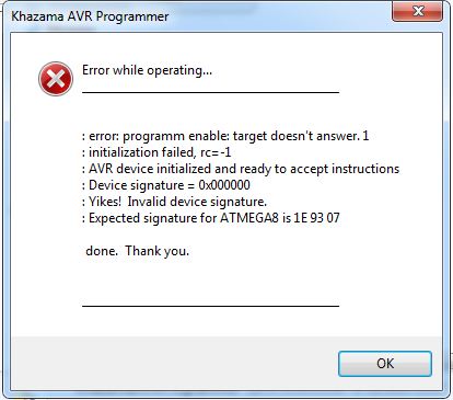 avrdude done. Thank you. Что было мной сделано: пробовал установить разные версии драйверов USBASPa, пробовал на системах XP SP3, Win7, результат не меняется. Кто нибуть сталкивался с подобной проблемой?, как вы считаете дело в кривых руках или в китайской прошивке контролера Меги8А? PS пардон за дублирование поста, но там удалить его уже нельзя